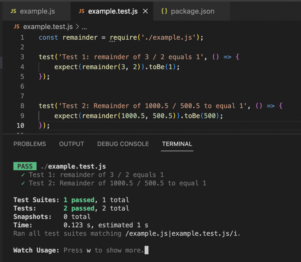 });Above, we’re testing the function remainder() with 1000.5 / 500.5 and expect the remainder to be 500.