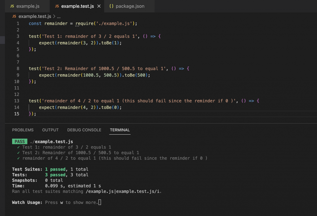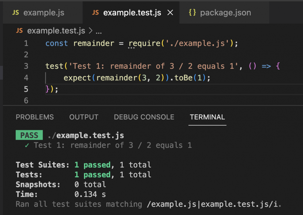 example.test.js. - A green check mark for our test ‘Test 1: remainder of 3 / 2 equals 1’