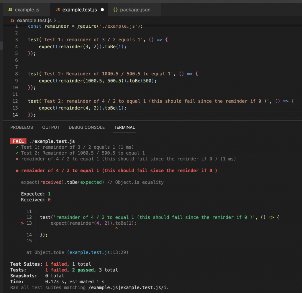 We now know why the test failed and how to fix it on line 14 of our example.test.js file. So let’s go fix the expected result to be 0 to make sure our tests pass.